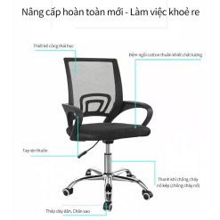- Chất liệu: tựa lưới, mặt ngồi cốt gỗ, đệm mút, bọc nỉ lưới xốp; tay chân ghế bàng nhựa đen