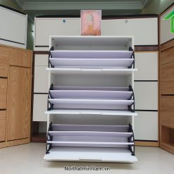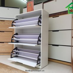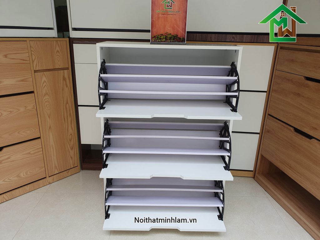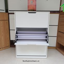 – Cánh mở lật thông minh, mỗi cánh chia làm 3 khoang để giày. Sức chứa gấp đôi tủ giầy thông thường cùng kích thước.