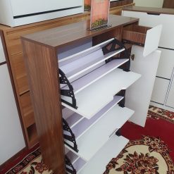 – Cánh mở lật thông minh, mỗi cánh chia làm 3 khoang để giày. Sức chứa gấp đôi tủ giầy thông thường cùng kích thước.